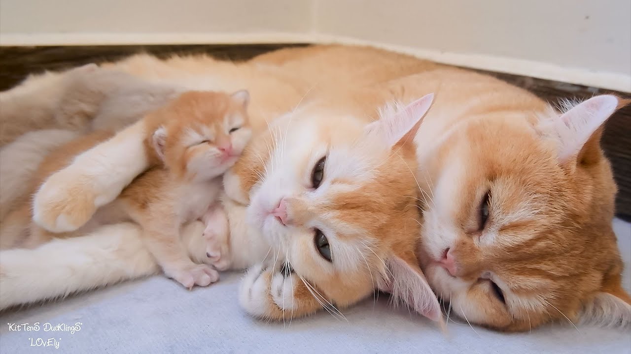 Daddy cat lovingly tends to mom cat and kittens, hugs all to sleep. Super happy family ??? !!!