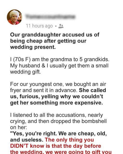 Our granddaughter accused us of being cheap after getting our wedding present