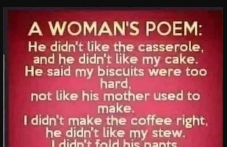 A WOMAN’S POEM: He didn’t like the casserole, and he didn’t like my cake. He said my biscuits were too hard, not like his mother used to make....